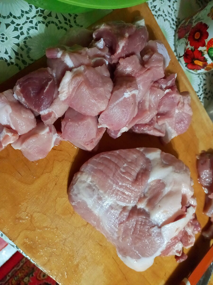 Моем, сушим мясо. Нарезаем кубиками 3×3, всё лишнее срезаем (пленочки, жир и т.д).
