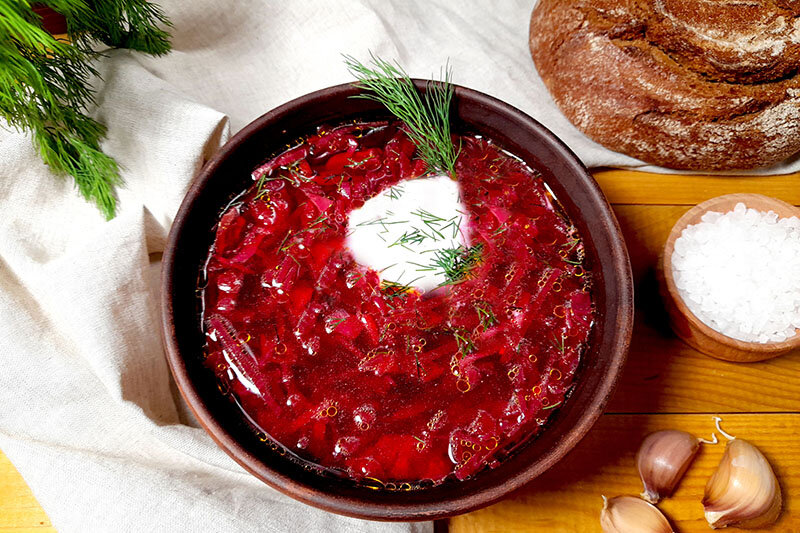Доводим до кипения бульон (или воду). Отправляем в кастрюлю капусту, а затем – пассерованные овощи, лавровый лист и горошины перца. Всё варим до готовности капусты. Как только капуста приобретёт необходимую мягкость, добавляем в кастрюлю тушёную свёклу и доводим борщ до кипения. Для сохранения насыщенного цвета окончательный вариант блюда не следует варить. Дополнительным гарантом яркости борща станет ложка уксуса, добавленная в бульон в последний момент перед тем, как вы отключите нагрев. готовому борщу прямо в тарелку принято добавлять сметану, мелко нарезанный чеснок и зелень укропа. Приятного аппетита!