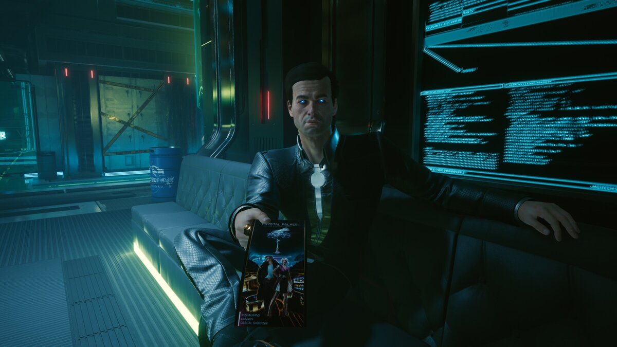 Сам Мистер Голубоглазый появляется в двух концовках Cyberpunk 2077, когда Ви становится сильнейшим наемником «Посмертия». Он предлагает нашему персонажу крупный заказ, связанный с похищением защищенных данных «Арасаки» в космосе.