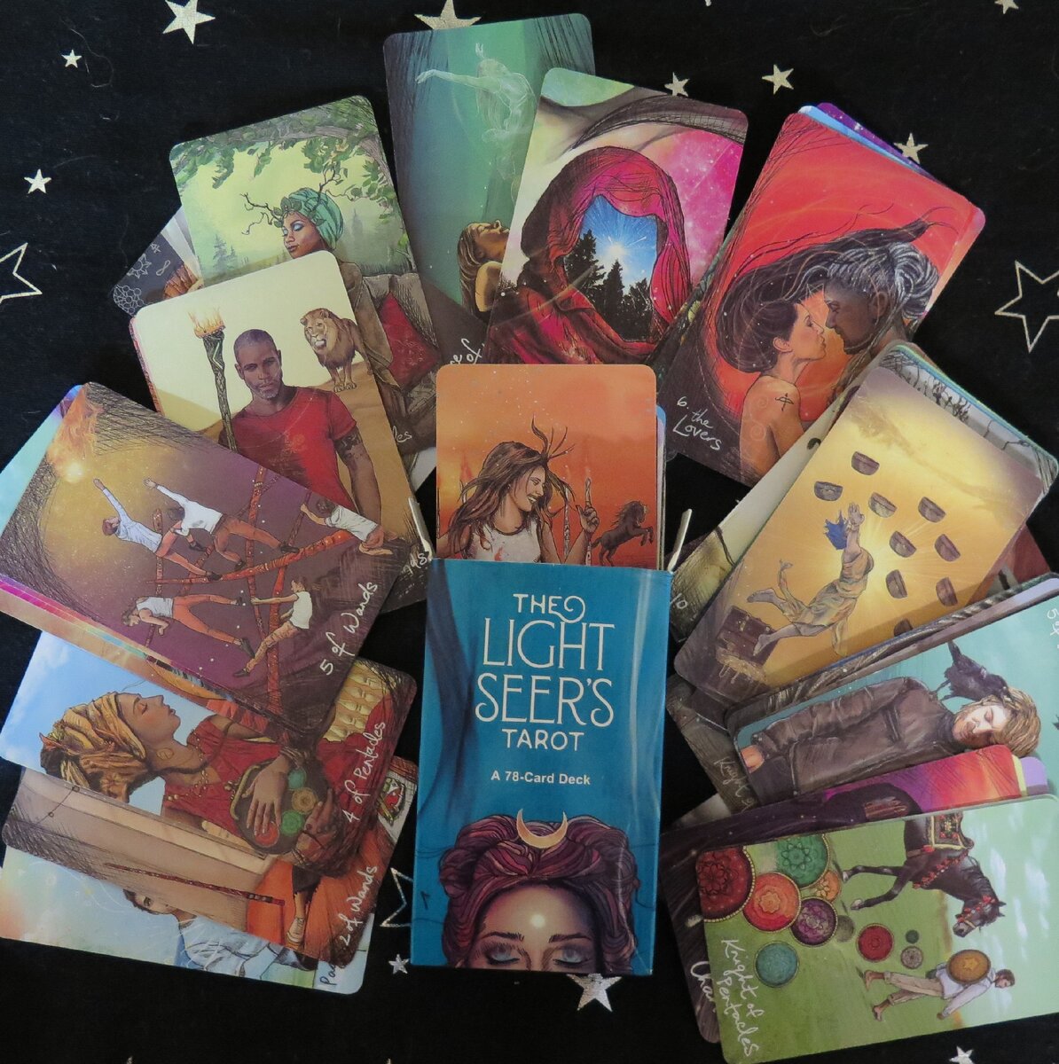 В прошлом году, кажется, эта колода была самой популярной в определённых кругах. Я долго присматривалась к ней, прикидывая, не слишком ли она для меня «карамельна», то есть позитивна и светла. Мне, как практику, не совсем нравится любой намёк на однобокое восприятие реальности. Затем, ближе к декабрю, я решилась и заказала её. И, когда эти иллюстрации попали ко мне в руки, я поняла, что никогда не пожалею об этом замечательном новогоднем подарке. Начнём со стилистики. Мне крайне импонируют открытые, не слишком яркие, нежные цвета палитры, нравится игра света и тени (да, в этих иллюстрациях очень много теней, как ни странно, и именно они гармонично уравновешивают сияние) и композиция каждого отдельного Аркана, точно выверенная и одновременно легкомысленная, без лишней академичности, пафоса и серьёзности. Герои Light Seer — это самые обычные люди, а вовсе не таинственные и отстранённые персонажи, какими большинство привыкло воспринимать героев Арканов Таро. И в этом отдельная ценность эт