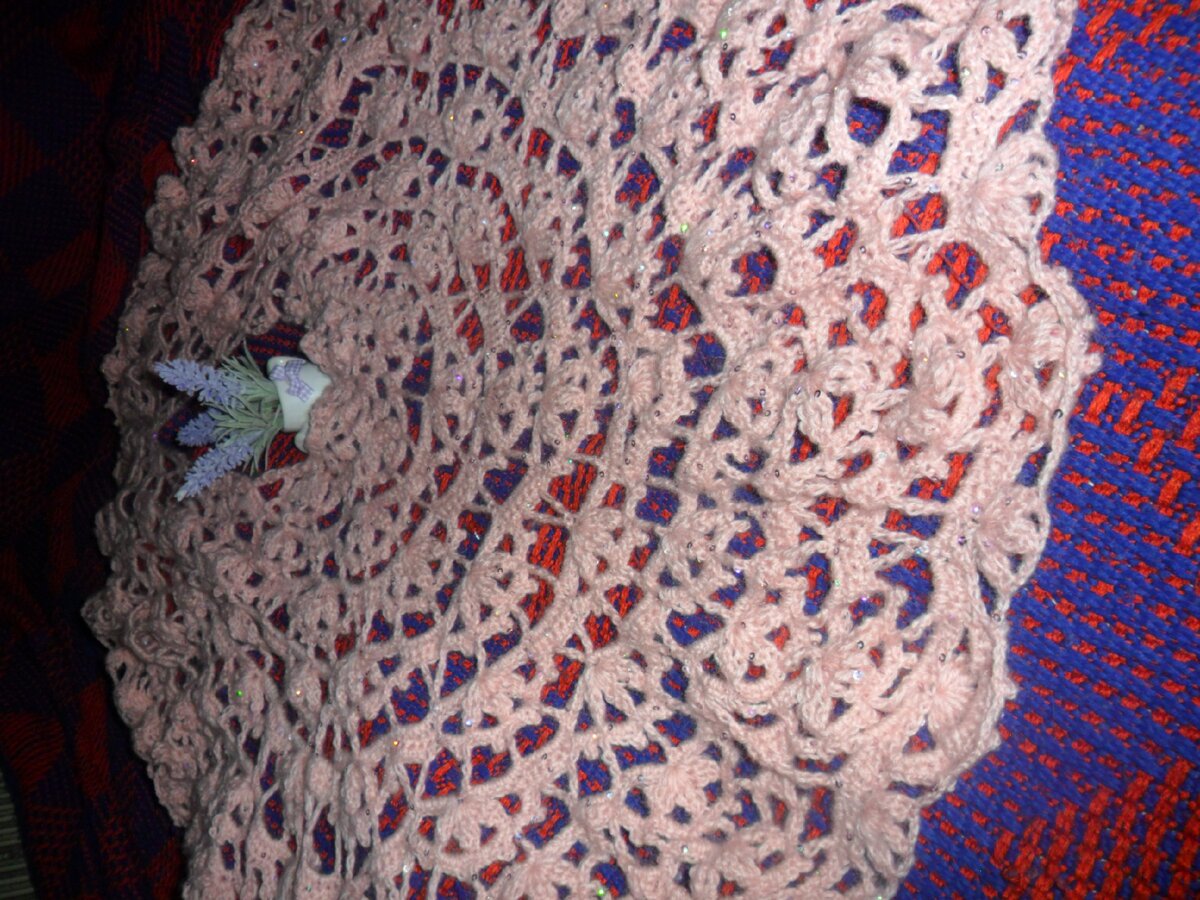 Вот такая , почти круговая накидка получилась из двух мотков мохера, крючек - 2,5 мм. Узор называется "Трилистник".