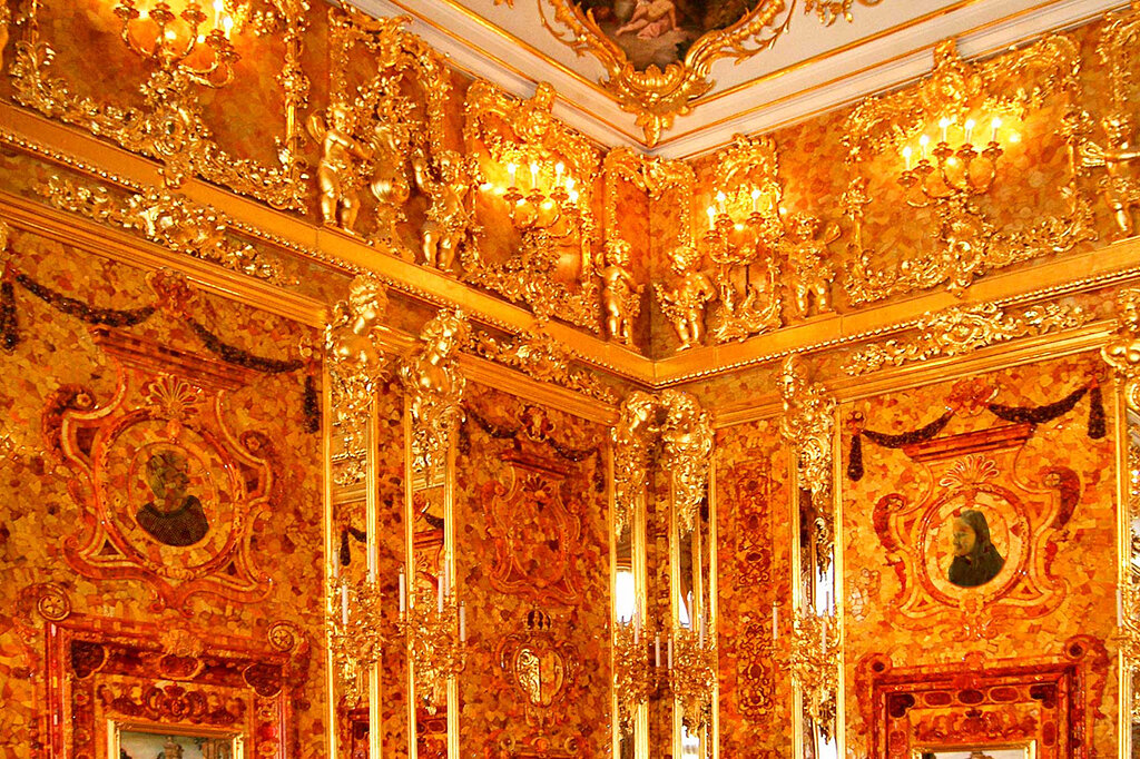 Сами россияне называют комнату одним из чудес света. Это действительно невероятно красивая комната. Происхождение этой комнаты окутано тайной. В этом контексте возникло множество легенд и мифов. Вероятно, янтарная комната создана между 1664 и 1714 годами. Одна из теорий гласит, что комнату привезли из Берлина в Петербург как подарок русскому царю Петру Великому. В 17-18 веках в Германии и России бурно развивалась добыча янтаря из Балтийского моря. Разные дары из янтаря были одними из любимых подарков важной знати. Строительство было завершено в 1770 году, для приготовления было использовано 450 кг янтаря.
