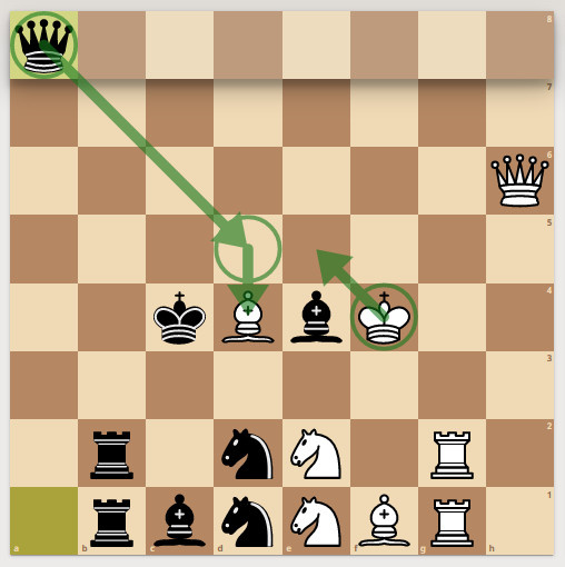 Здесь вместо симметричного ответа Белого Ферзя на Ферзь а6 белыми. Черные решают сыграть Ферзь а8.