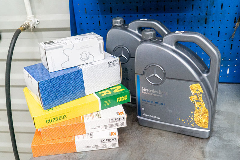 Также заливается рекомендованное моторное масло. Мы использовали оригинальное масло Mercedes SAE 5W-40 с допуском 229.5, подходящее для моторов M276.