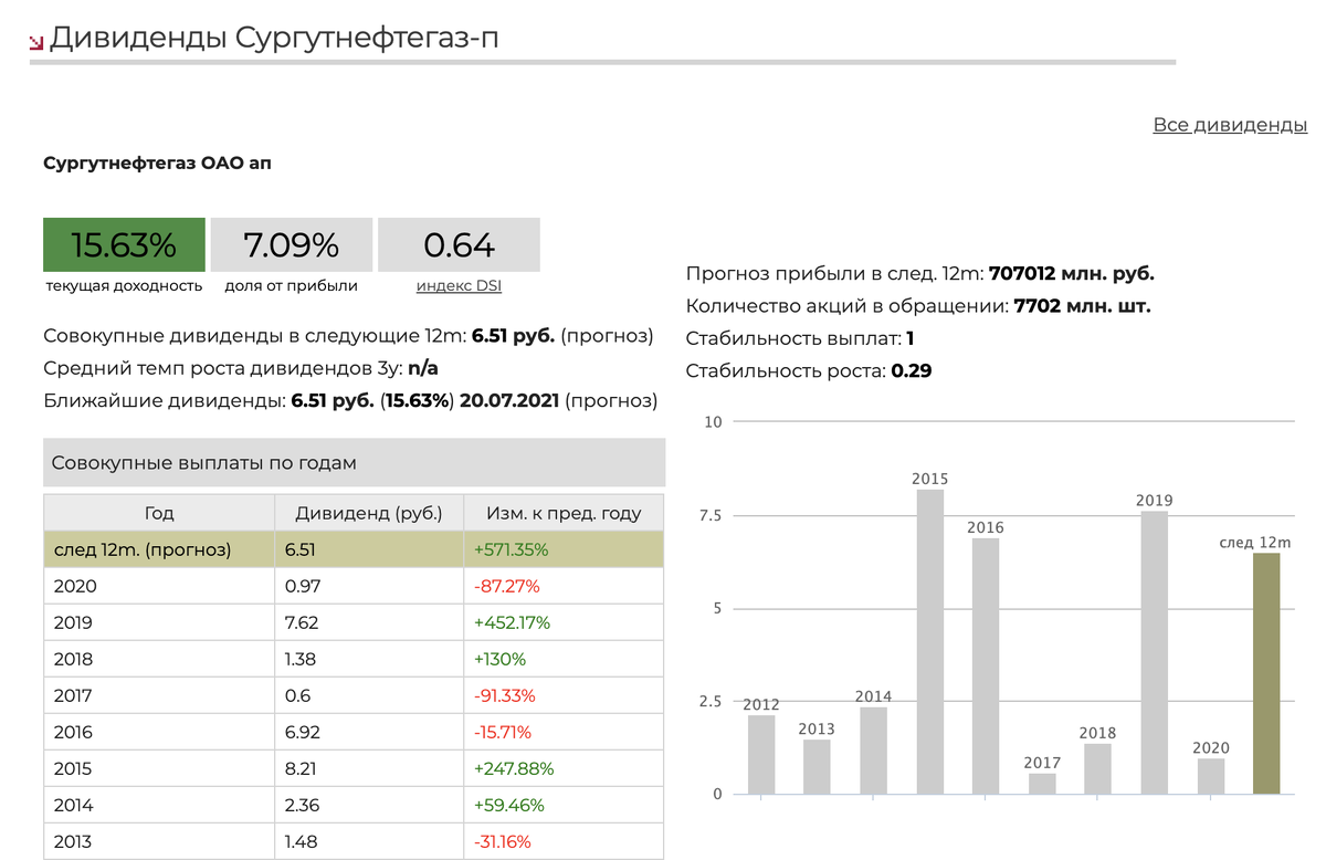 Заходим на сайт Дохода в карточку этой бумаги по ссылке: https://www.dohod.ru/ik/analytics/dividend/sngsp