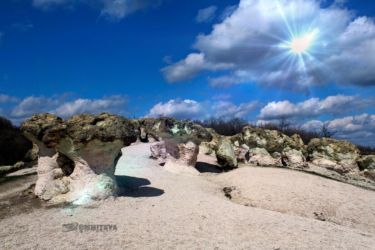 Природный феномен Каменные грибы находится в 1м км. северно от села Белый пласт,у самой дороги между Хасково и Кърджали (южная Болгария)