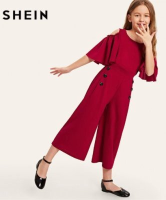 SHEIN 07190107285 – стильный комбинезон для настоящих маленьких леди. В ассортименте есть 5 трендовых оттенков и размеры 6–12T. Вещь отлично смотрится благодаря деталям: кнопки по бокам штанин и разрезы на плечах. Расклешенные брюки и рукава-воланы подойдут девочке с любым телосложением. Сшит костюм из полиэстера с добавлением спандекса, он немного тянется.