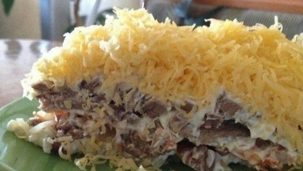 Отделить белки от желтков. По отдельности натереть. Мясо и грибы мелко порезать. Сыр натереть на мелкой терке. Мясо заправить йогуртом. Выкладываем слоями снизу вверх: мясо, грибы, йогурт, белки, йогурт, сыр, йогурт, желтки, украсить зеленью.