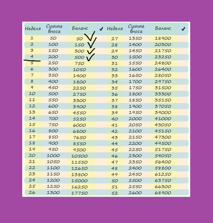 Такой же марафон проводит и Дама в кредитах, но для меня сейчас проще каждую неделю переводить по несколько сотен рублей, чем каждый день переводить число из таблицы.