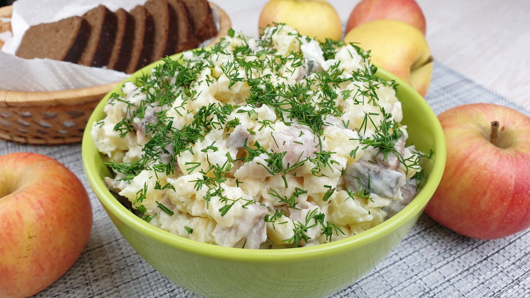 - Сегодня мы приготовим очень вкусный салат с селедкой и яблоком. Мы очень любим такие простые салаты, из категории - гости на пороге. Простые и вкусные салаты содержат в себе минимум ингредиентов, которые к тому же доступны для всех. И готовить мы будем наш салат с яблоком, селедкой, картошкой и луком. Если вам нравятся рецепты вкусных салатов, которые можно приготовить легко и быстро, обязательно попробуйте этот рецепт. Итак, наши простые рецепты салатов на скорую руку.