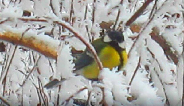 На ветках по утрам скачут синицы. Я сыплю им в кормушку подсолнечные семечки и привязываю сало. А они радуют меня своим весёлым щебетом, создавая прекрасное позитивное настроение. На фоне веток в снегу синички красотки