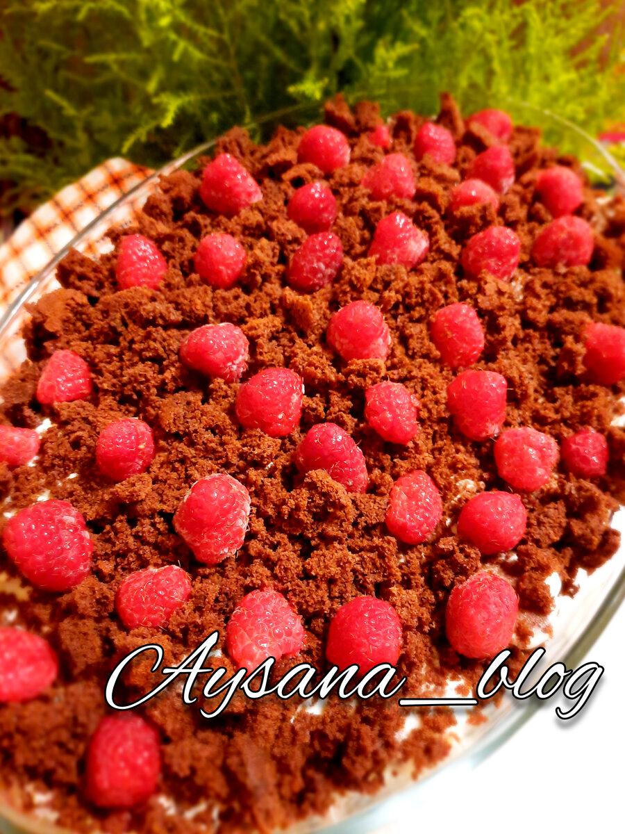 В форму для десерта выложить часть нарезанных кусочков, так чтобы получился слой, смазать его кремом. Поверх крема выложить вишню, смазать кремом. Далее выложить ещё один слой из нарезки, смазать кремом, присыпать крошкой и украсить малиной.