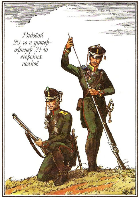 Русские егерские полки вели свою историю со времен Семилетней войны. К 1786 г. в российской армии насчитывалось почти 30 тыс. егерей. М. И. Кутузов командовал егерскими полками и фактически составил общие правила егерской службы. В инструкции по подготовке егерей 1789 г. подчеркивалась необходимость выработки навыков меткой стрельбы, подвижности, применения хитрости и умелого использования особенностей рельефа в целях маскировки. Например, егерь должен был уметь перезаряжать оружие лежа на спине, стрелять из-за препятствий и при необходимости падать на землю. Он должен был обманывать противника, притворяясь мертвым или используя собственный кивер в качестве мишени. С какого-то момента егеря стали ассоциироваться с Г. А. Потемкиным и войнами России против Османской империи. Потемкин ввел удобную и практичную униформу, соответствовавшую климатическим условиям южных степных районов России и Балкан и боевым задачам, стоявшим перед российской армией в этих районах. В инструкциях для егерей указывалось, что солдаты не должны были тратить время на чистку ружей.