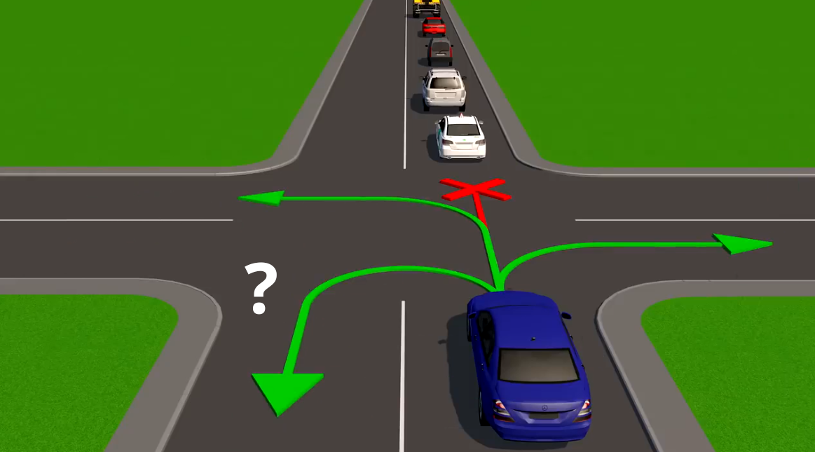 А что, если водителю синего автомобиля нужно развернуться? Нарушил ли он Правила дорожного движения?