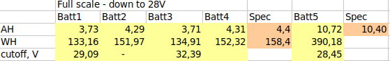 Смотрим результат — графики сжаты, чтобы лучше было видны характеристики аккумуляторов гироскутера: А тут можно сравнить с батареей на 10.4 Ач Анализ емкости с отсечной 28 Вольт: То же, но отсечка 32.5 Вольт: Как видно, 2 аккумулятора оказались практически в идеальном состоянии. Два потеряли в районе 20% емкости, но это еще не смерть и их вполне можно использовать. Обозреваемый аккумулятор соответствует описанию, емкость 10.4Ач, напряжение отключения BMS несколько отличается — 28.45 вольта вместо заявленных 28. Недостатком это вряд ли является — реально этот аккумулятор можно использовать до 33 вольт, после чего напряжение очень быстро падает. Такой же нижний уровень и у аккумуляторов от гироскутера. Для корректного измерения внутреннего сопротивления аппаратуры нет, да это и бессмысленно в данной конфигурации — к сопротивлению элементов добавляется сопротивление BMS, проводов, разъемов. Но тем не менее пусть будет для прикидочной оценки — но имейте в виду — это в основном паразитные сопротивления, а не внутреннее сопротивление элементов. Заключение — никакого обмана нет, аккумулятор вполне достойный. Два месяца я на нем прокатался — это около 20 циклов заряд/разряд.