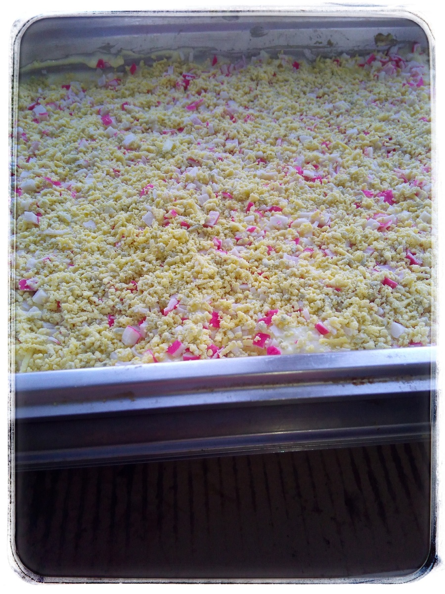 Потребуется: Майонез - 0,675; крабовые палочки -0,225; консервы рыбные -6 банок; картофель отварной - 2,250; лук репчатый - 0,540; яйца - 10 шт. Картофель и яйца отварить. Картофель натереть на крупной тёрке добавить к нему рыбные консервы предварительно слив из банок сок,посолить,перемешать и выложить это смесь в форму ровным слоем. Берём отварные яйца и отделяем белок от желтка. Белок натираем
