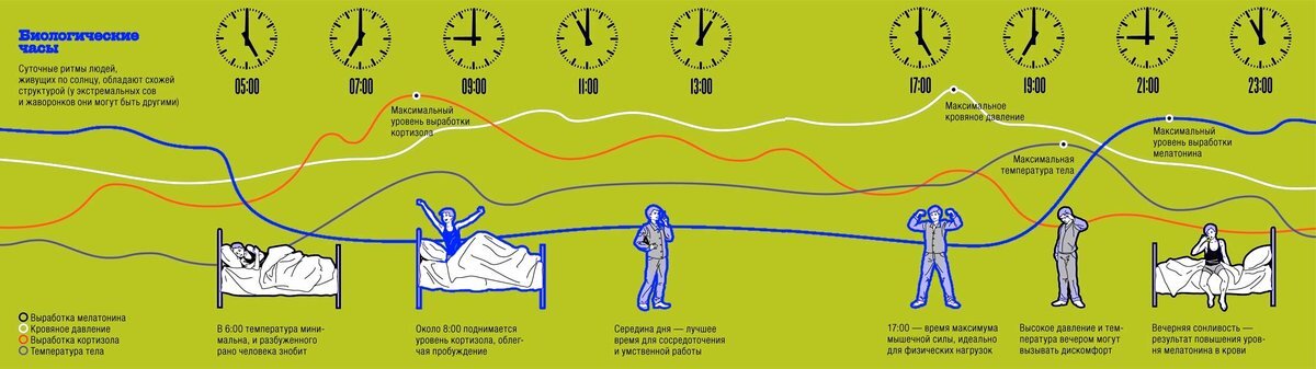 Наконец, новосибирцы в составе международной группы недавно пополнили список оттенков хронотипов еще двумя разновидностями. Это категории людей, максимальная бодрость которых приходится на дневные часы, и те, что принадлежат к типу умеренно активных: они работоспособны весь день, но активность «тает» постепенно.
