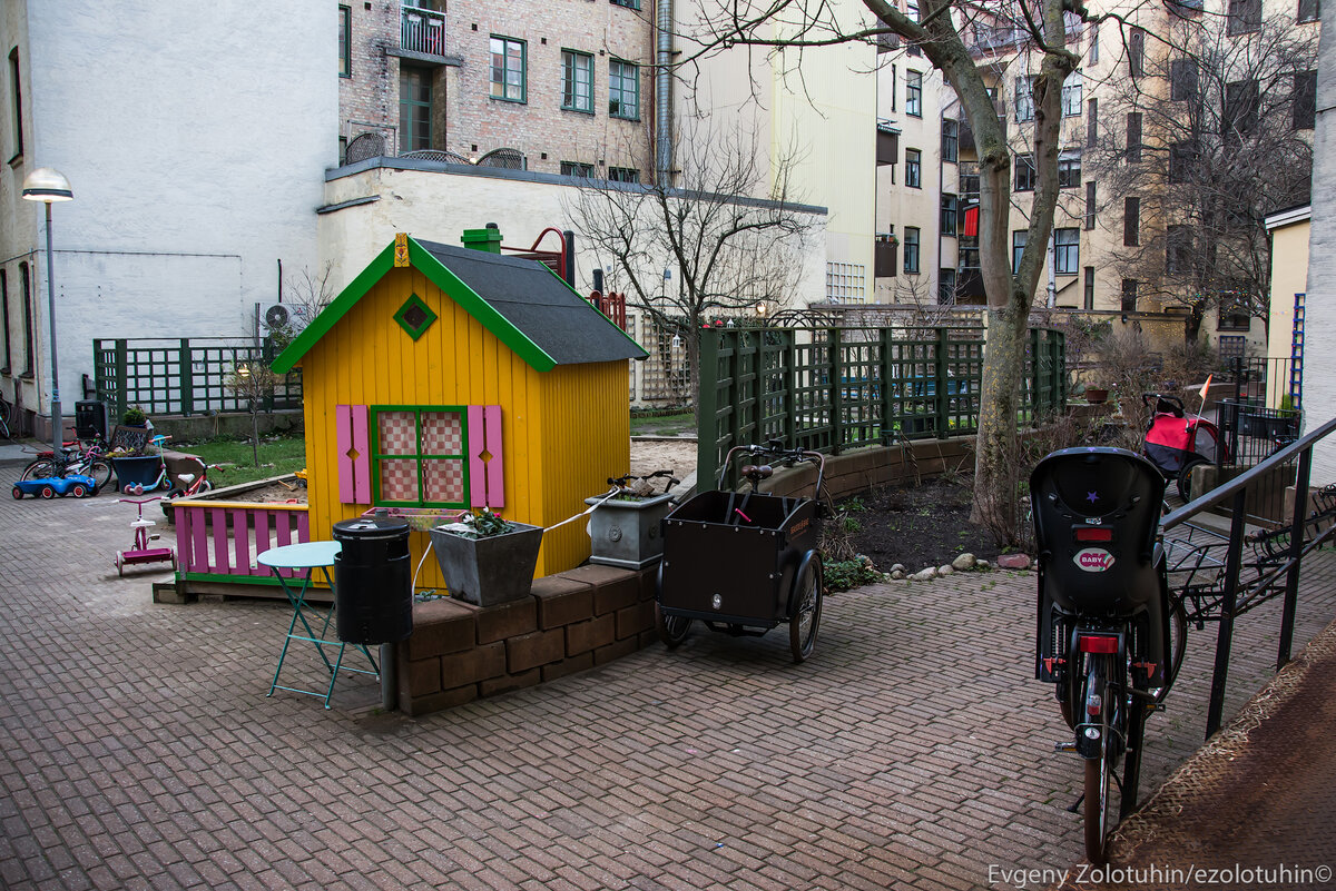 В Швеции снова свои особенности. Снова никаких машин, все пространства предназначено для отдыха людей. Здесь и классные уютные детские площадки, и столики со стульями. Очень приятное место, тут действительно хочется жить.