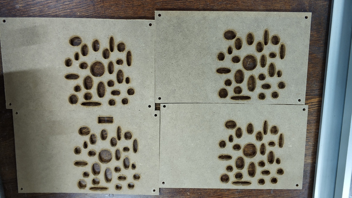Сначала на станке я вырезал разного размера кружки и овалы предварительно изготовив проект для станка. Далее по необходимым размерам отрезал лишнее и обработал детальки. Так же вырезал дно будущего светильника.