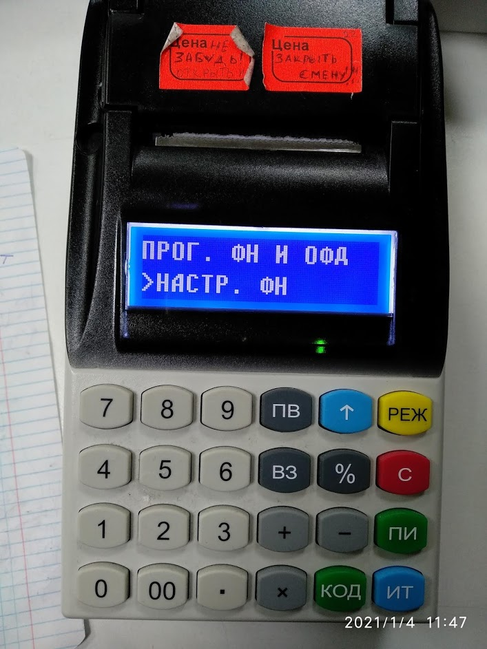 Кнопками + или - ищем режим Прог. ФН и ОФД -->ИТ--> пароль: 22-->ИТ