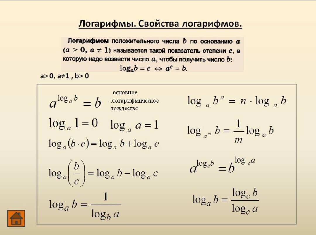 Логарифм положительного числа по основанию (обозначается ) – это показатель степени, в которую надо возвести , чтобы получить . b > 0, a > 0, а≠ 1.