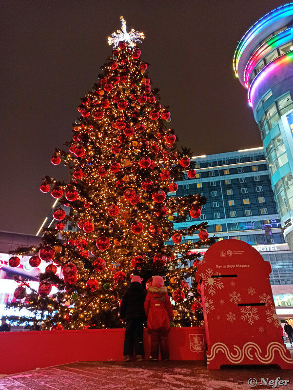 После застолья, проводив старый год, пошли погулять и проветриться. Дело было за несколько часов до полуночи. Это елка на Киевской, прям около выхода из метро. Фотография не постановочная, дети реально стояли и рассматривали елку, я просто поймала кадр.