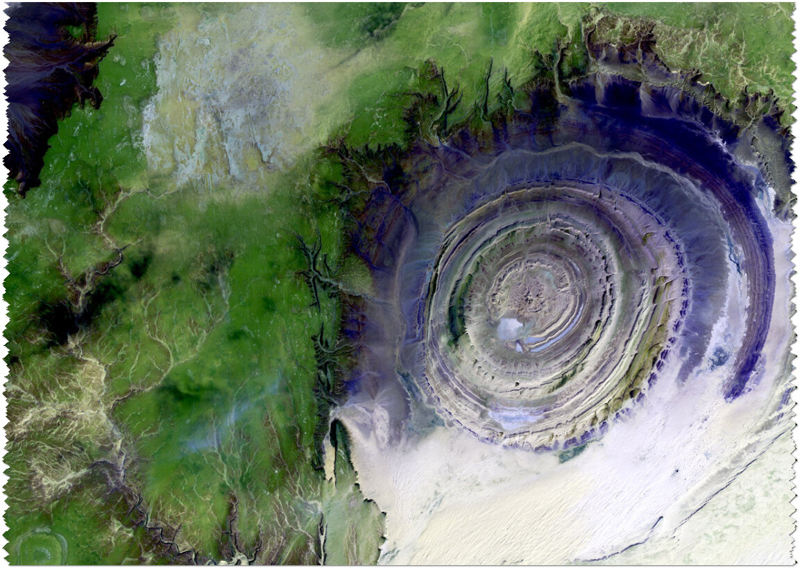 Структура Ришат — геологическое образование на западе величайшей пустыни нашей планеты. Его ширина — 50 километров, благодаря чему «кратер» виден из космоса. В настоящее время местность принадлежит Мавританской республике: она посещается лишь самыми отважными туристами. При населении до 4-х миллионов человек, 90% территории преимущественное необитаемые пески и барханы. Теперь, когда каждый из нас может оценить «Глаз Сахары» с высоты спутников, возникает закономерный вопрос о его происхождении. Действительно, разве нечто масштабное могло появиться более 500 миллионов лет назад, без воздействия космического объекта? Да, могло. Но при условии, что все разбросанные осколки растащили люди. Метеоритный удар, должен был оставить характерный кратер, и множество «следов» ударного воздействия. Возможно, пески пустыни скрыли следы? Тут без раскопок не обойтись, поэтому эту версию считаем за приоритетную, ведь следующая на грани фантастики. Представьте, что с околоземной орбиты в почву врезается