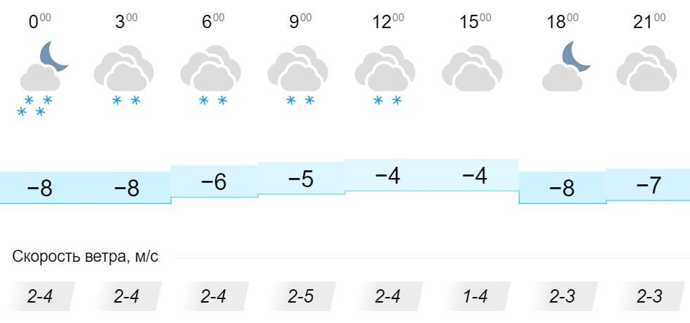 Весь день будет пасмурно, при этом осадки в виде снега ожидаются в первой половине дня. Скорость ветра в течение дня составит 2-5 м/с.