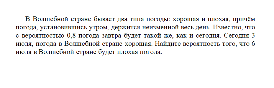 По условию известно, что погода завтра станет такой же как и сегодня с вероятностью 0,8. Сегодня 3 число, погода ХОРОШАЯ, значит вероятность того, что 4-го числа будет такой-же равна 0,8, а вероятность того что она станет ПЛОХОЙ (т.е. ИЗМЕНИТСЯ )равна 1 - 0,8 = 0,2 (сумма этих вероятностей равна 1).