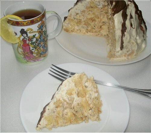 Сначала слой бисквита со сметаной, потом ананас, потом орехи и т. д., постепенно образуя конус.