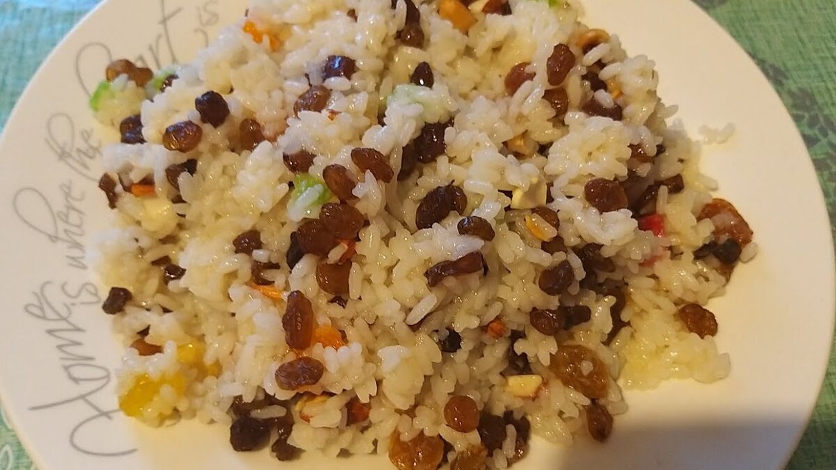 Нарезать чернослив и курагу. Растолочь миндаль. Если вся вода не выкипела, её следует слить, рис охладить. Добавить в рис сухофрукты, мёд и орехи.