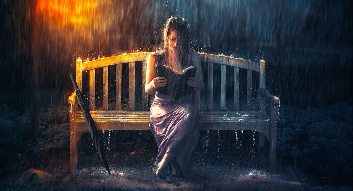 Дождь усилился, и мне пришлось рассматривать фигуру через его стену. Чем ближе я подходил, тем больше и как-то волнительно замирало мое сердце: на скамейке сидела девушка. Большой черный зонт лежал возле нее нераскрытым, босые ступни стояли прямо на мокрой земле, а она читала, игнорируя поток воды, льющийся в книгу. Фонарь светил прямо на нее, отчего ее волосы сияли рыжеватым огнем. Я замер, боясь спугнуть ее. Но она так была увлечена своим чтением, что заметила меня только когда я тихонько кашлянул.
