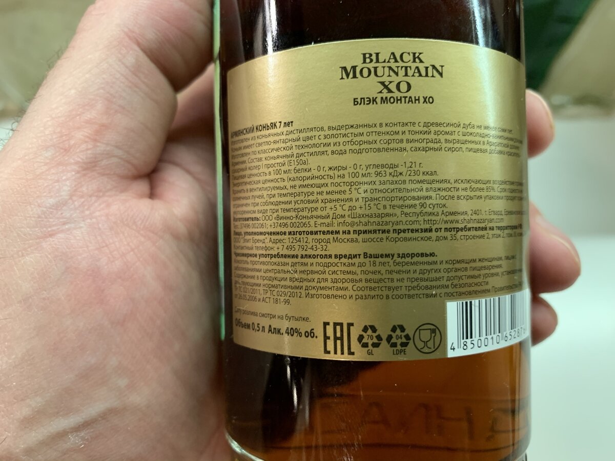 И вот сегодня у нас следующий представитель Шахназарян Black Mountain XO. Читаем контр-этикетку и понимаем, что она один в один дублирует описание предыдущего напитка. Такие же светло-янтарные тона с шоколадно-ванильными ароматами. При