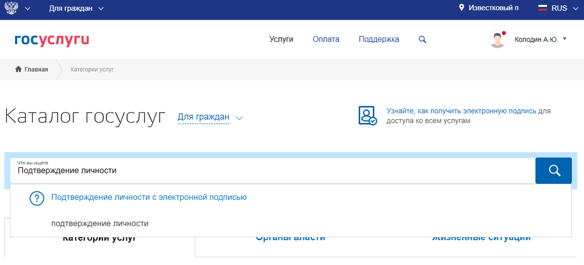 Теперь же нам нужно перейти во вкладку "Каталог услуг". Ищем там "Подтверждение личности с электронной подписью". Если вы это делали через мобильное приложение, вас перенаправит на официальный сайт. Там мы ищем позицию "Подтвердить учётную запись", выбрав которую сайт показывает нам все способы подтверждения личности.