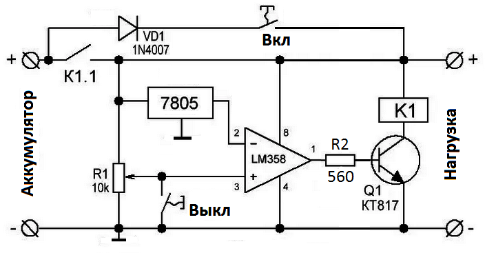 Как известно, глубокий разряд аккумулятора сокращает его срок службы. Для предотвращения подобных ситуаций используются специальные схемы, одна из которых показана на рисунке выше.