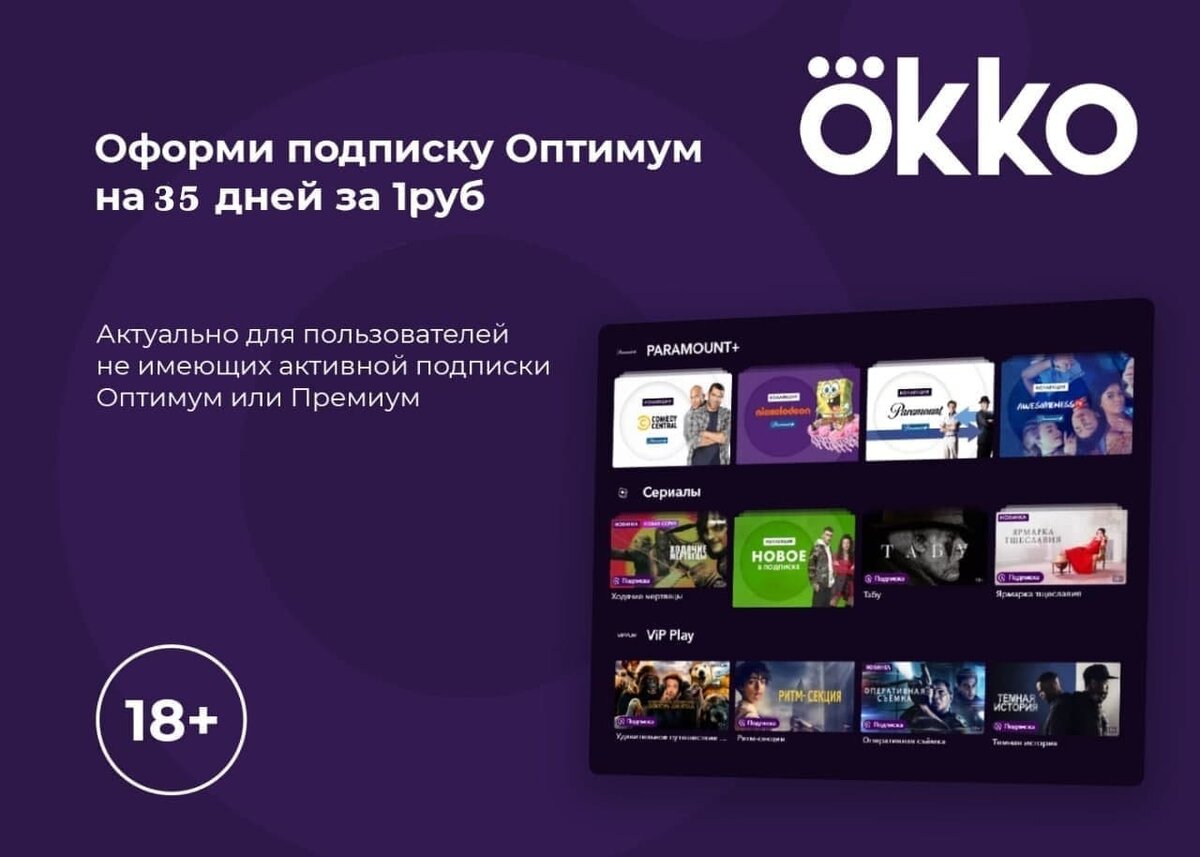 1. Okko на 35 дней подписки "Оптимум" всего за 1₽ по промокоду.