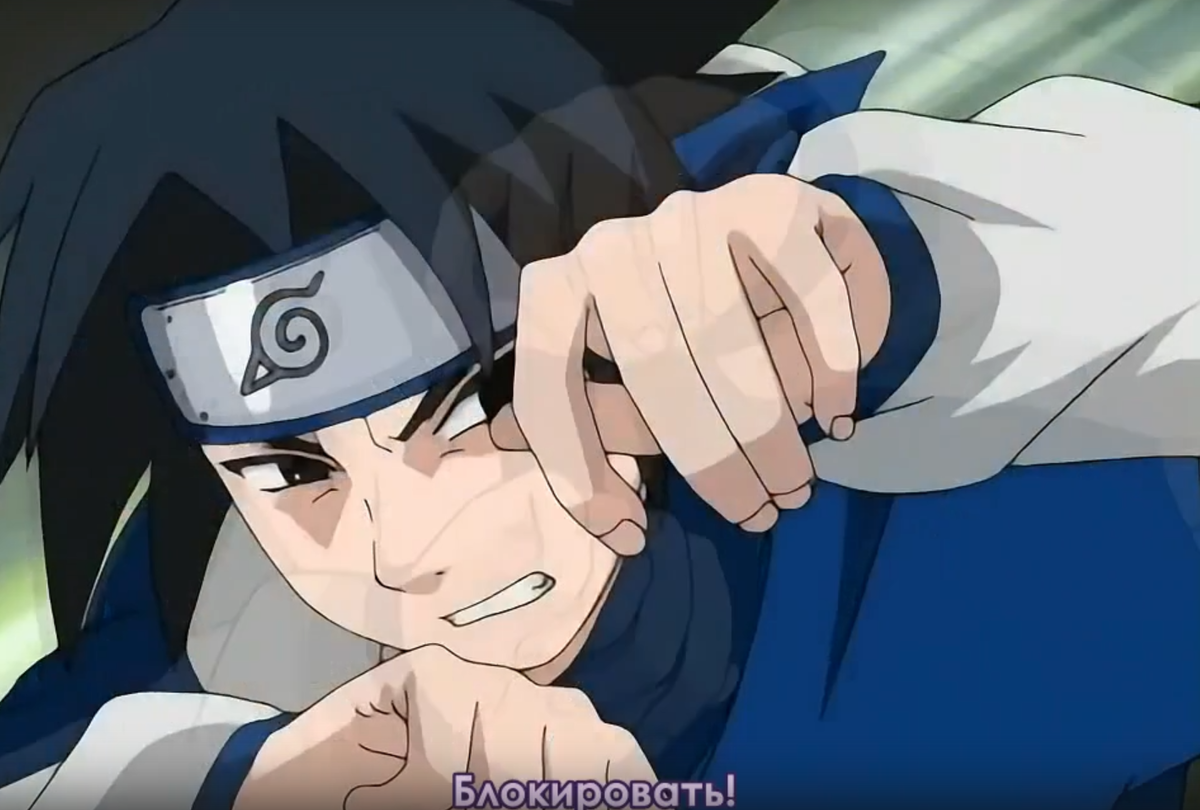 Сперва сделаю акцент на первом пропущенном ударе. Итак, Саске увернулся от Урагана Конохи, и тут же, как будто танцуя брейкданс, Ли отправляет на него следующую атаку. Саске расценивает, что уворот уже невозможен, т.к он попросту не успевает и принимает решение выставить блок.