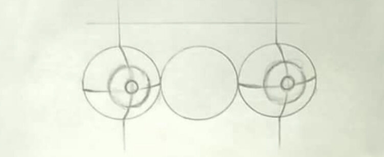 Чертим два кругу и внутри их рисуем две линии. Расстояние между кругами ровняется одному кругу. Рисуем зрачки и радужки. Обозначаем сверху линию где будут у нас брови.