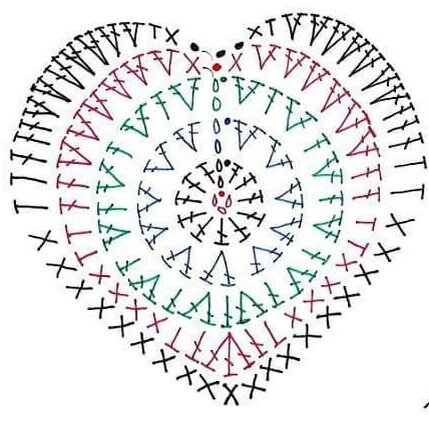 - Далее переходу к вязанию контура сердца для этого провязываем ряд обозначенный на рисунке красным цветом, как показано на схеме. Если вам надо сердце побольше, то вяжем дальше ряд обозначенный черным цветом.