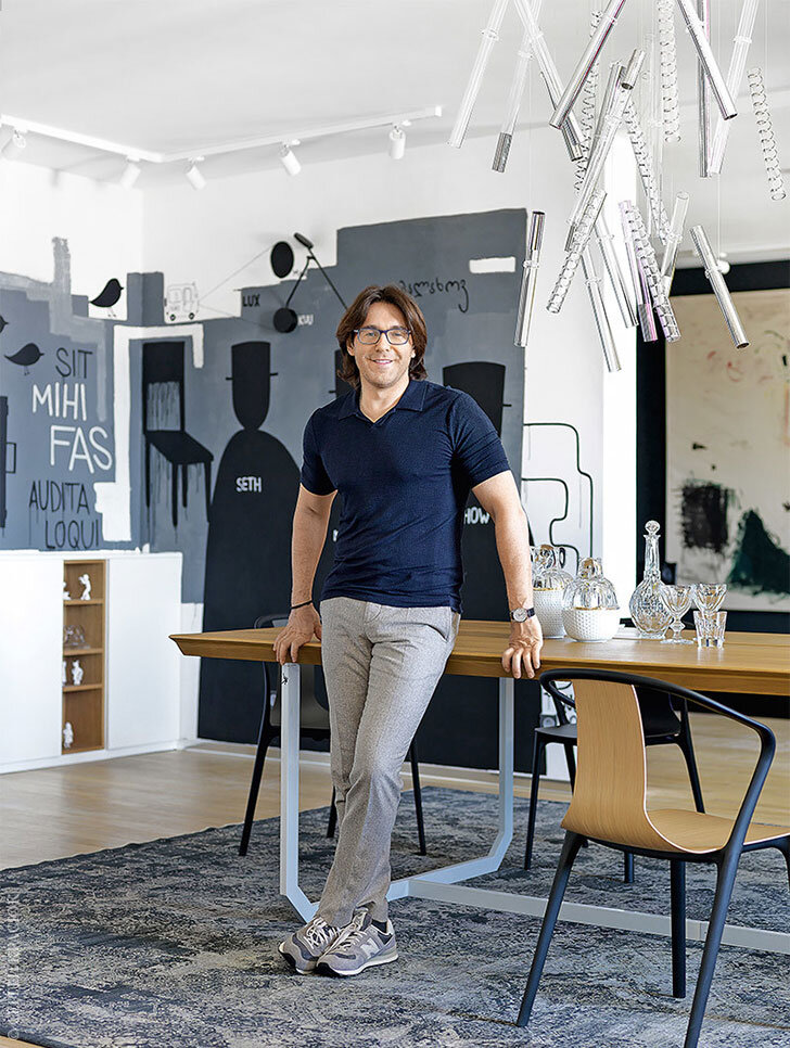 Но смысл дизайна кроется крутится не только вокруг искусства, хоть оно занимает здесь большую часть, но и в отдельных мелочах, которые имеют определенные ассоциации у ведущего и связаны с различными воспоминаниями. Например, кроссворд на стене - необычное решение, которое в то же время напоминает о каникулах, проведенных у бабушки, которые он проводил за разгадыванием кроссвордов из журнала "Крокодил".