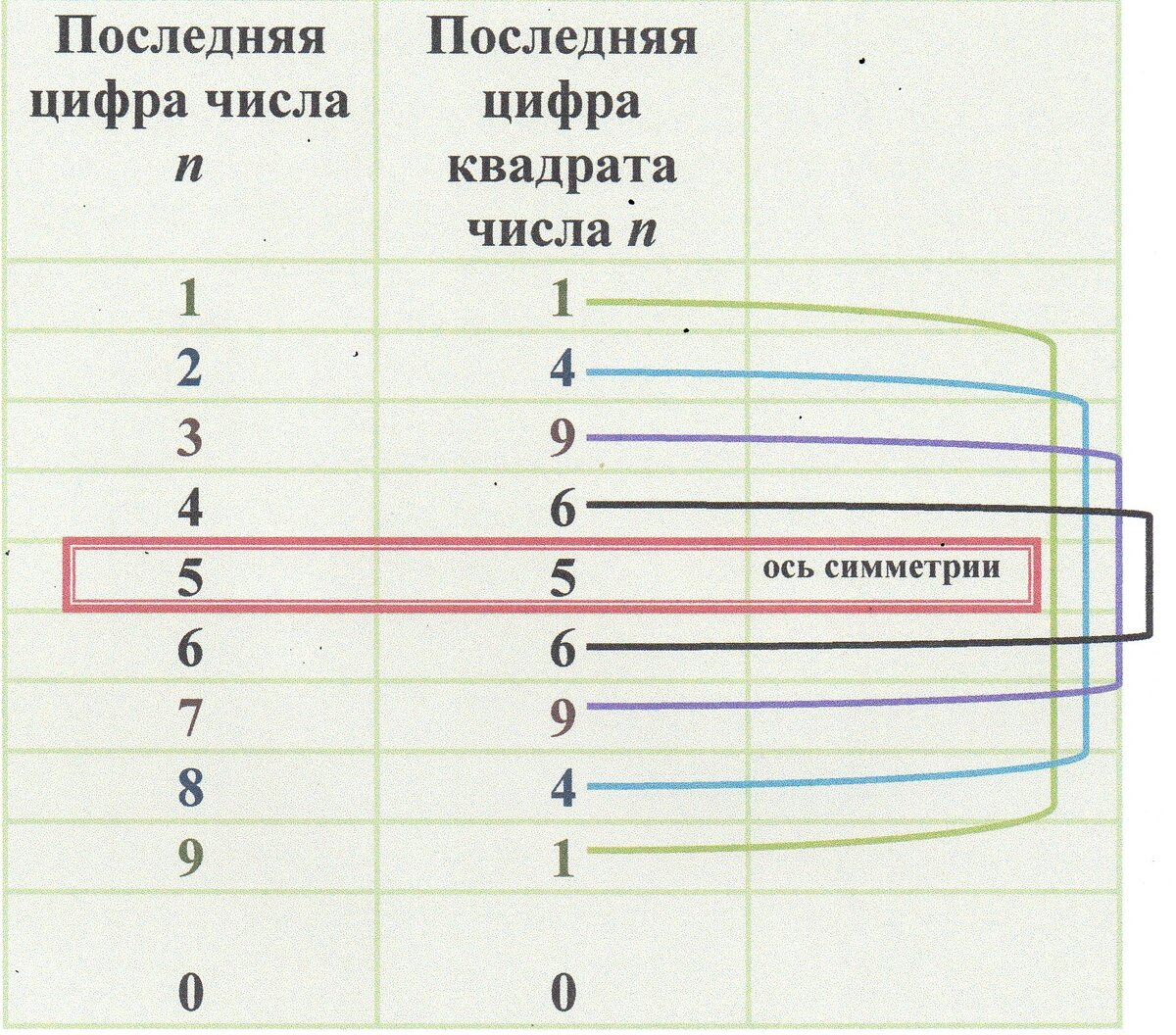 Из таблицы понятно, что если натуральное число является полным квадратом, то оно может заканчиваться только цифрами 1; 4; 9; 6; 5 или 0.