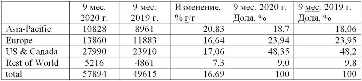 Как видно выше в таблице, Европа и США растут медленнее, чем в целом мир. Активно растут Азиатско-Тихоокеанский регион и «остальные страны мира».