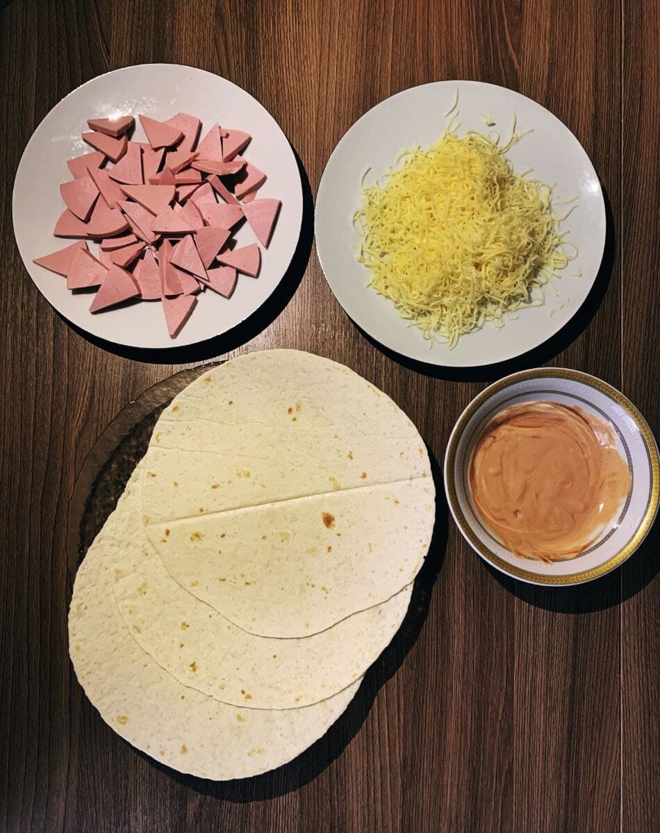 Вам понадобятся: лаваш, колбаса (сосиски), сыр, кетчуп + майонез (любой другой соус тоже подойдёт). В качестве начинки ещё можете добавить шампиньоны, отваренную курицу, помидоры - всё на ваш вкус при наличии времени.