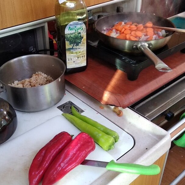 Параллельно обжарить на оливковом масле одну крупную луковицу, доложить к ней нарубленные кружками