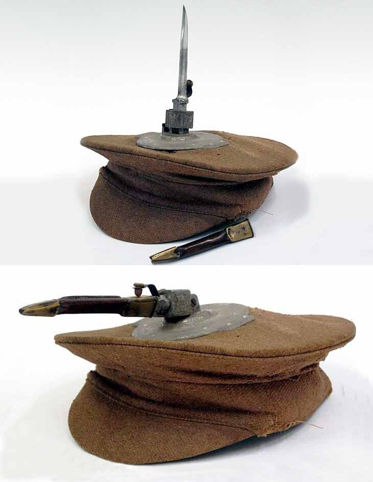 В январе 1916 года некий британский адвокат Филипп Бейкер запатентовал и представил в Британское Военное ведомство проект «улучшений для каски и иных армейских головных уборов». Более того, за свой счет он изготовил несколько опытных образцов на базе фуражки. Улучшение заключалось в установке на каски и фуражки специального складного штык-ножа. В походном положении он располагался горизонтально земле в ножнах и переводился в боевое одним щелчком пружинного механизма. Хотя Бейкер вполне серьезно утверждал, что его изобретением можно «защищаться и поражать врага, не выпуская из рук винтовку», все-таки основным способом обращения со штык-фуражкой было снять ее с готовы и, удерживая за поперечную рукоятку с внутренней стороны, орудовать как ножом-кастетом. При этом ткань фуражки давала некую защиту кисти. Плюс наличие на фуражке металлической конструкции хоть как-то улучшало ее защитные качества. А в случае с каской получался и вовсе аналог фехтовального щита-баклера, которые были довольно популярны в Европе 16го века.
