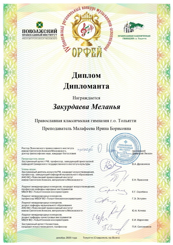 Ученики Православной классической гимназии, класс фортепиано преподавателя И. Б.Малафеевой, приняли участие и стали дипломантами 4 Поволжского регионального конкурса музыкантов-исполнителей «Орфей», который проводится Поволжским православным институтом. Искренне поздравляем наших учеников Феклина Федора, Закурдаеву Меланью, Горлову Софью в покорении новых вершин искусства! Благодарим и их преподавателя Малафееву Ирину Борисовну!