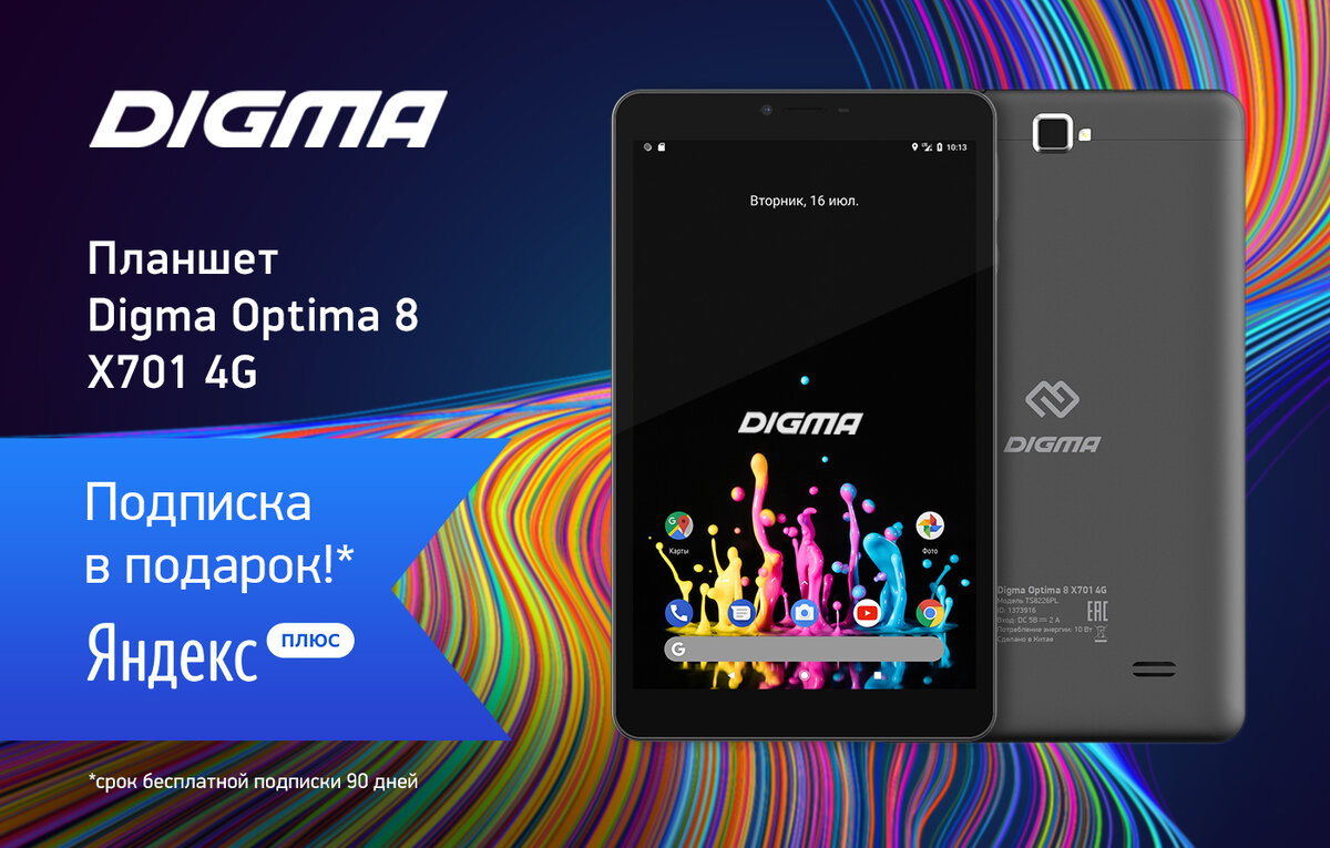Кроме того, покупатели получают в подарок бесплатную подписку Яндекс.Плюс*. Напомним: Яндекс.Плюс даёт возможность доступа к музыке, фильмам, кэшбэку баллами, 10 ГБ на сервисе Яндекс.Диск и скидку на такси — всё в одной подписке, которую вы получаете вместе с покупкой планшета, указанного в этом пресс-релизе. Смотрите кино и самые новые сериалы на КиноПоиск HD, слушайте музыку и подкасты на Музыке, получайте кешбэк баллами и тратьте их на такси, каршеринг, билеты в кино и многое, многое другое вместе с DIGMA!