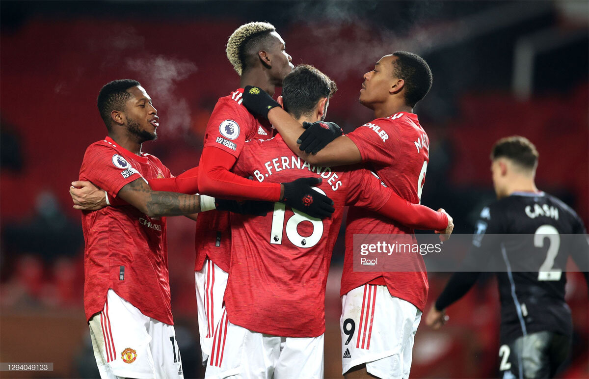 "Манчестер Юнайтед", игравшему с куда менее звёздной, нежели "Челси", "Астон Виллой", для набора трёх очков пришлось потрудиться куда сильнее, чем соседям из "Сити". "Красные дьяволы" вырвали победу благодаря пенальти, реализованному Бруну Фернандешем на 61-й минуте. В целом же манкунианцы и "вилланы" провели достаточно равный матч. На исходе первого тайма Марсьяль в падении замкнул прострел Ван-Биссаки и открыл счёт, напомнив-таки бирмингемцам, кто на "Олд Траффорд" хозяин. Но гости нисколько не растерялись. Подшефные Дина Смита здорово начали второй игровой отрезок, и на 58-й минуте Траоре здорово распорядился мячом после подачи Грилиша. Однако музыка для "вилланов" играла недолго: спустя три минуты Дуглас Луис уронил в своей штрафной Погба, и Фернандеш с "точки" забил свой 11-й гол в сезоне. Благодаря этому успеху "МЮ" набрал 33 очка и догнал в турнирной таблице "Ливерпуль".