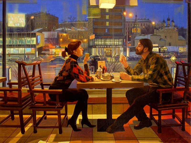 В кафе заходит Юлия. Видит Матвея, она обрадована встрече, стоит у входа, не решается сразу подойти. Матвей ест, ничего не подозревая.