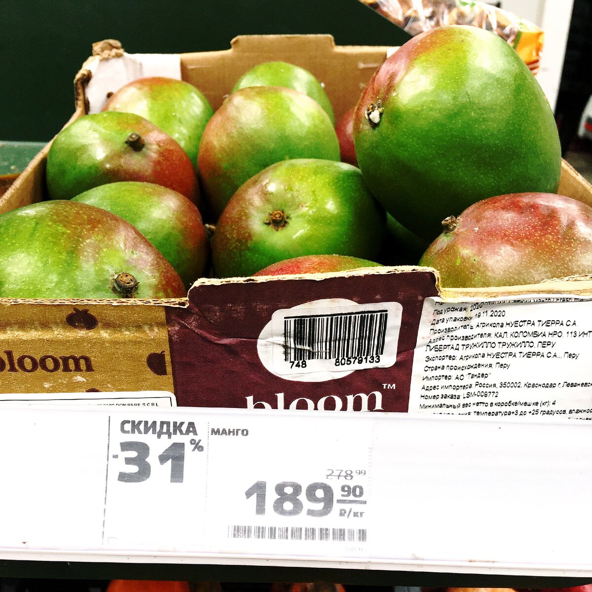 Перуанские манго довольно сладкие и сочные. Почти все твёрдые, но можно повыбирать и найти несколько мягких. Один плод выходит примерно 65-70 ₽ при таком ценнике. Пробую делать с ним салаты.